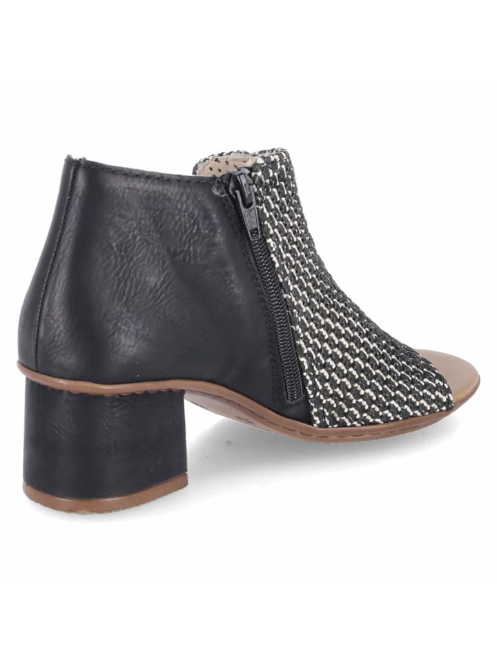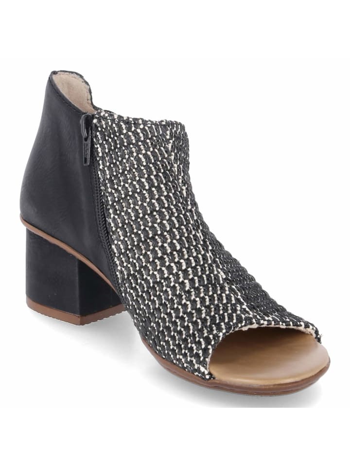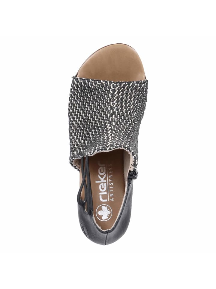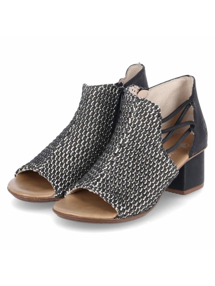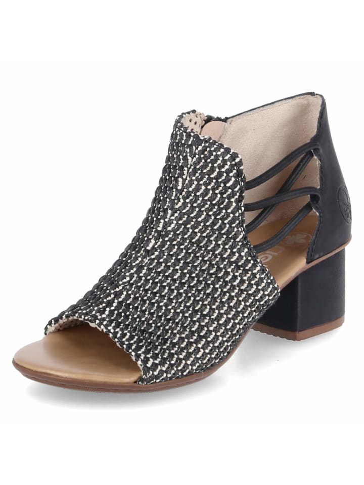Эти черные женские босоножки Rieker из высококачественного синтетического материала сочетают в себе модные детали и комфорт. Плетеный перед создает легкий летний образ, а молния и эластичные резинки по бокам на щиколотке обеспечивают легкое надевание и гибкую посадку. Мягкая стелька обеспечивает комфортное ощущение при ходьбе, а прочный блочный каблук обеспечивает надежную поддержку и женственный силуэт - идеально подходит для стильных повседневных образов или летних мероприятий.