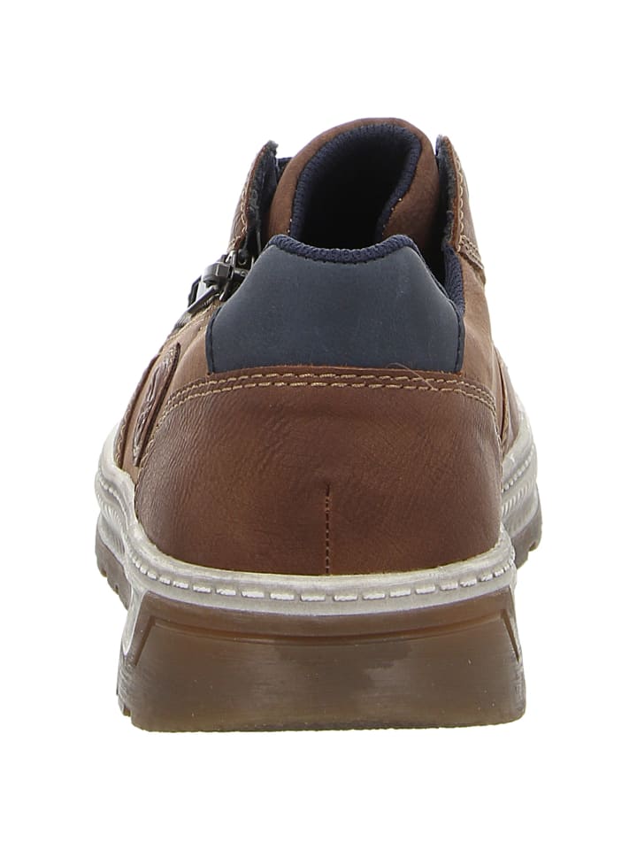 Эти коричневые спортивные туфли на шнуровке от Rieker идеально подходят для мужчин, ведущих активный образ. Визуально обувь привлекает внимание высококачественной искусственной кожей с вощеным эффектом, динамичной декоративной строчкой и спортивным кроем. Мягкая сетчатая ткань внутри обеспечивает оптимальный микроклимат стопы. Благодаря молнии и шнуровке туфли идеально сидят на ноге и легко надеваются. Скрытая клиновидная пятка смягчает шаги и обеспечивает комфортный перекат. Будь то классический джинсовый образ, повседневная обувь или обувь для офиса - вы не сможете пропустить эти туфли Rieker!