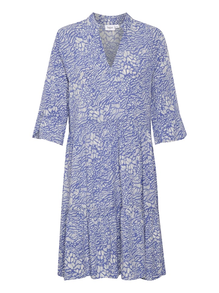 Это свободное платье с V-образным вырезом и многоуровневым кроем обеспечивает комфорт и стиль. Рукава три четверти и длина до колена обеспечивают модную универсальность.