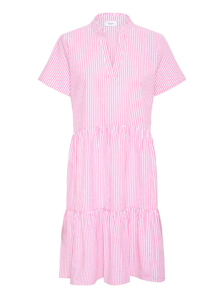 Это платье впечатляет свободным кроем, длиной до колена и короткими рукавами. Воротник-стойка и V-образный вырез придают современную элегантность. Приятно легкое, идеально подходит для повседневной носки.