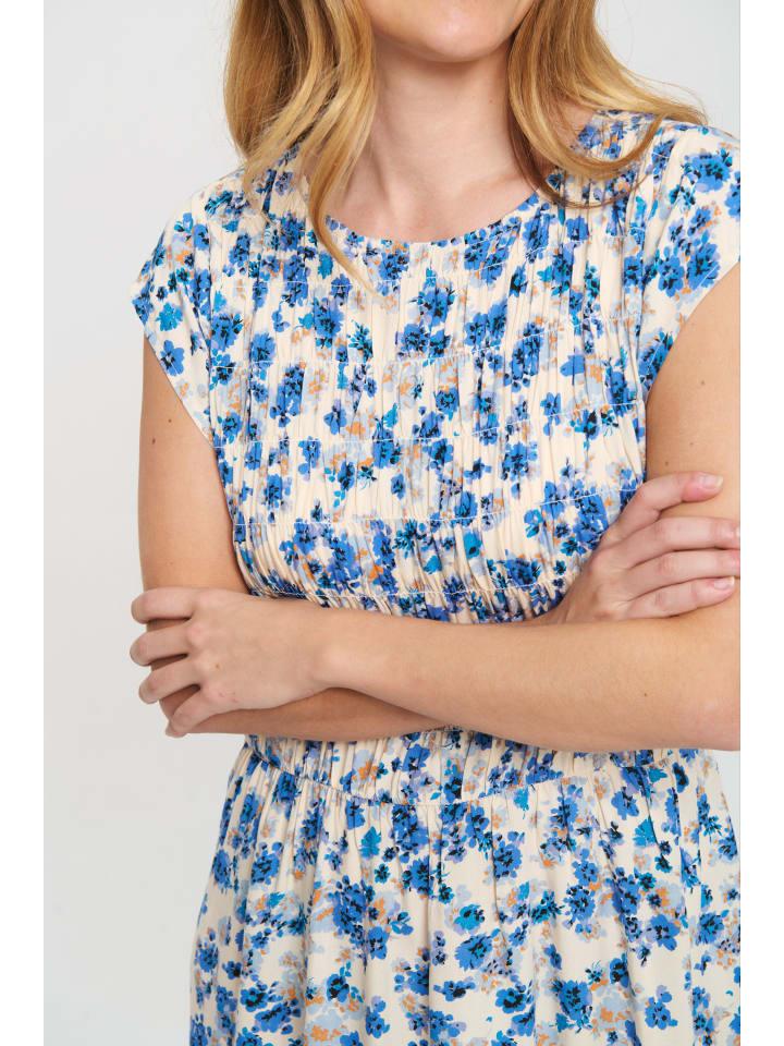 Женское платье миди удобной посадки с круглым вырезом и короткими рукавами. Присборенный верх подчеркивает талию и обеспечивает высокий уровень комфорта.