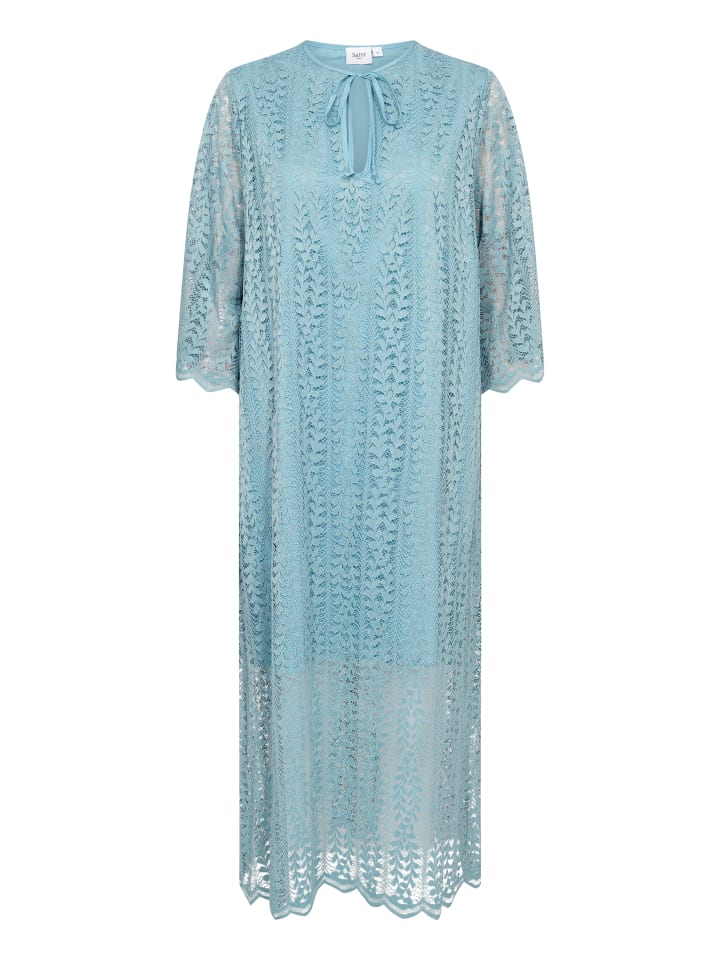 Это кружевное платье миди свободного кроя с круглым вырезом на завязке и рукавами три четверти. Воздушный материал обеспечивает комфорт в самых разных ситуациях.