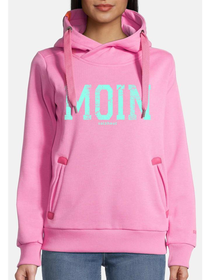 Детали включают в себя прохладную вышивку в виде соляной кожи на левом плече, толстовку со шнурком, два боковых кармана с кожаной отделкой и прочные ребристые манжеты. Худи доступно в различных цветах, включая темно-синий с неоново-розовым принтом, коралловый с белым или неоново-оранжевым принтом, аквамарин с неоново-розовым принтом и черный с розовым. Дизайн дополняет яркий трафаретный принт MOIN, который придает толстовке особый шарм.
