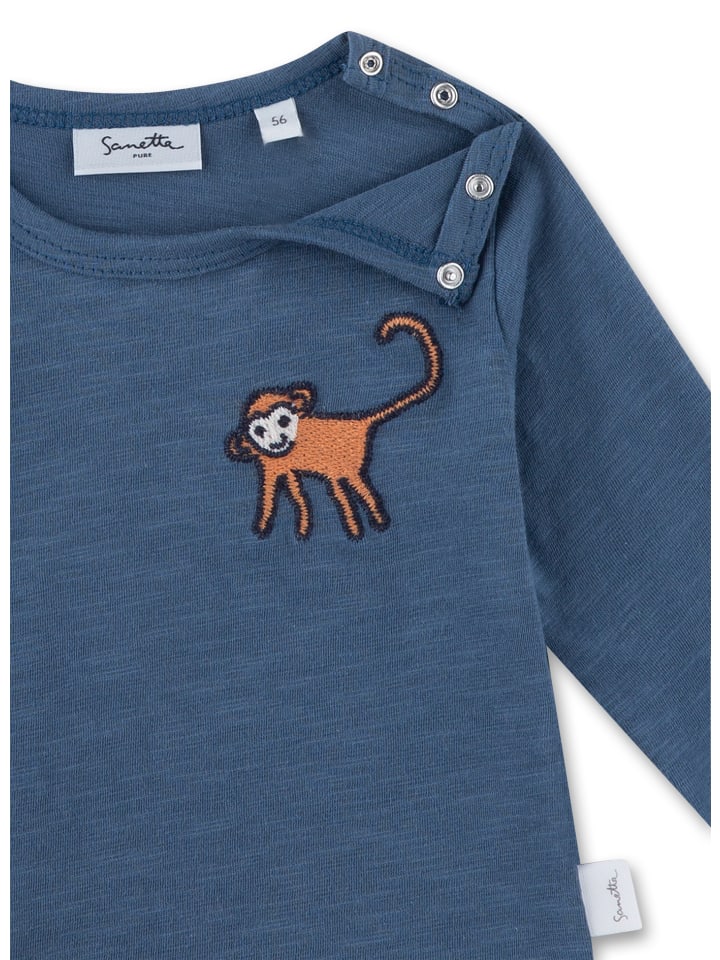 Фантастическая рубашка с длинными рукавами для мальчиков от Sanetta Pure в приглушенном синем тоне с маленьким рисунком обезьянки на левой стороне груди.