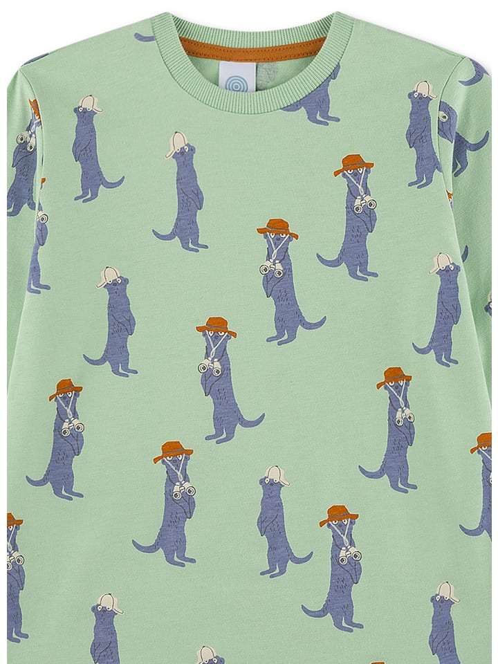 Веселая пижама от Sanetta для мальчиков в зеленом и синем цветах с забавным сурикатом сверху.