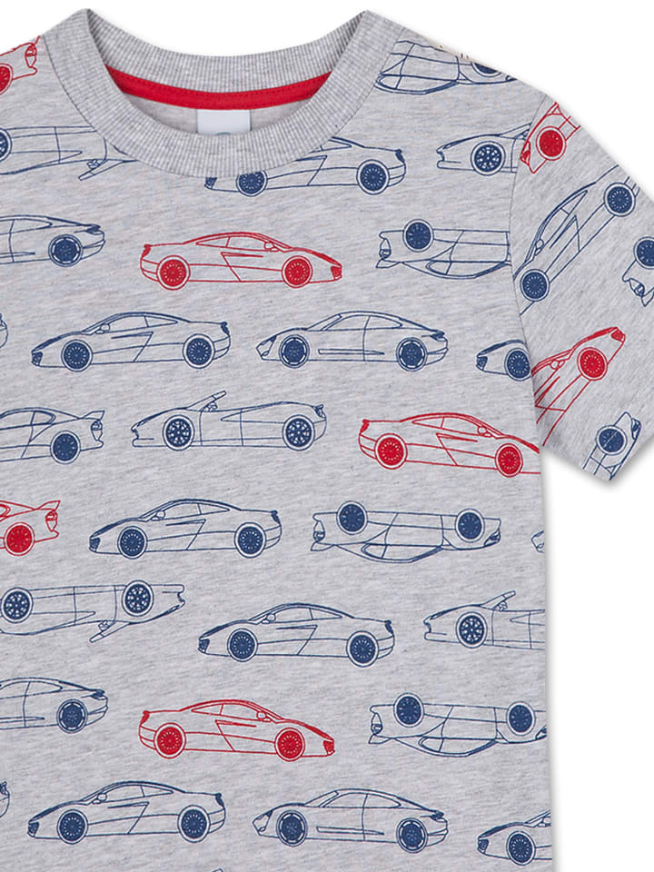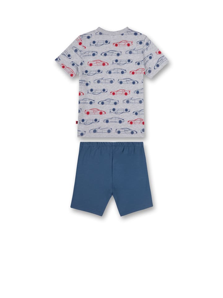 Короткая пижама для мальчиков для теплых летних ночей в современной цветовой гамме с классным принтом машин по всей поверхности.