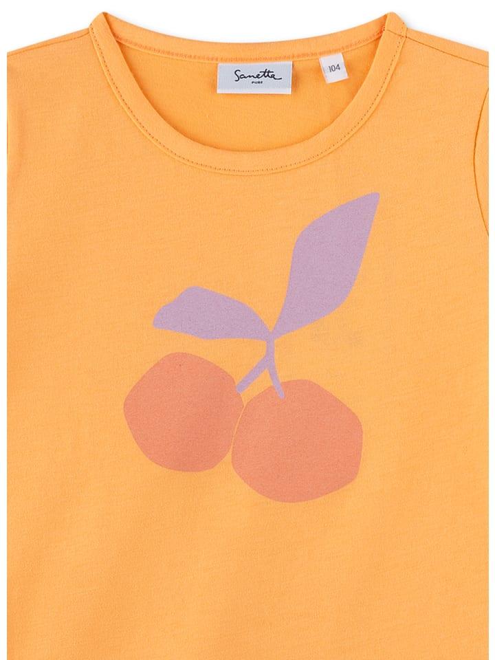 Летняя футболка для девочек в модной цветовой гамме с изображением летних фруктов на груди от Sanetta Pure.