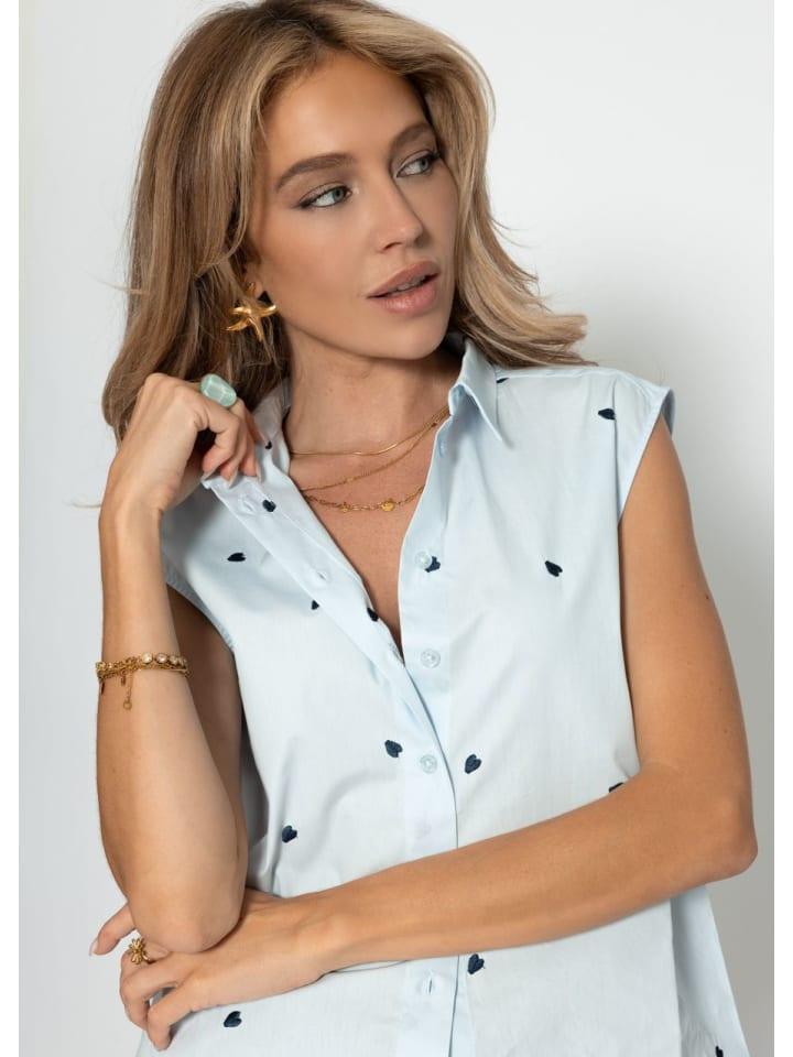 Эта блузка без рукавов - настоящая летняя изюминка, пленяющая своим игривым шармом и женственными деталями. Белая ткань, расшитая маленькими красными сердечками, придает образу нежность и одновременно современность. Прямой, свободный крой обеспечивает легкость и приятную свободу движений - идеально для теплых дней. Классические элементы, такие как рубашечный воротник и длинная планка с пуговицами, придают модели вневременную элегантность. Независимо от того, носите ли вы ее повседневно с джинсами, в сочетании с шортами или в элегантном варианте под пиджаком, эта блузка универсальна и сделает любой наряд притягивающим взгляд.