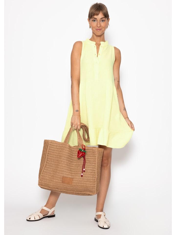 Это летнее платье без рукавов излучает легкость и непринужденную элегантность. Мягкая муслиновая ткань приятна к телу, делая его идеальным спутником для теплых дней. Свободный крой создает ощущение легкости и естественно подчеркивает фигуру. Женственный силуэт, слегка гофрированный воротник-стойка и изящная планка с пуговицами на груди - все это создает очаровательные детали. Оборка по подолу добавляет движения и подчеркивает игривый образ. Будь то прогулка по городу, пляж или вечеринка в саду - это платье можно стилизовать по-разному и легко адаптировать к любому случаю.
