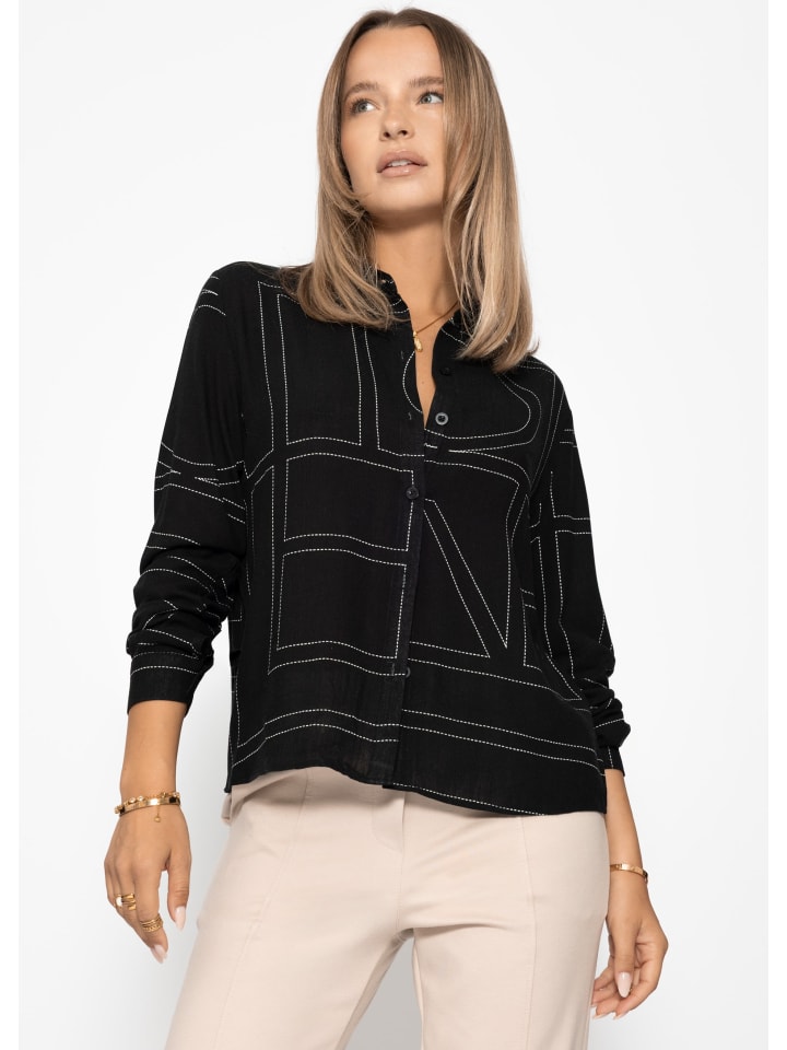 Эта блузка выполнена из современной, легкой ткани и эффектно смотрится благодаря яркому графическому принту по всей поверхности. Классический рубашечный воротник завершает дизайн и придает изделию вневременной характер, делая его универсальным как для повседневной носки, так и для особых случаев. Прямой крой со спущенными плечами создает свободный крой, который удобно драпируется и гарантирует свободу движений. Это создает ощущение комфорта, которое удобно носить в офисе, на отдыхе или на мероприятиях. Особого внимания заслуживают тщательно проработанные детали: длинная планка с пуговицами, длинные рукава и изящные контрастные швы, которые подчеркивают графический рисунок и добавляют стильный штрих к общему образу. Благодаря своей универсальности блузку можно сочетать с любым случаем: повседневно с джинсами и кроссовками, элегантно с брюками или юбками, и даже как яркий ключевой элемент под пиджаком. Это делает его незаменимой частью любого гардероба и предлагает бесчисленные варианты стилизации для современных, уверенных образов.