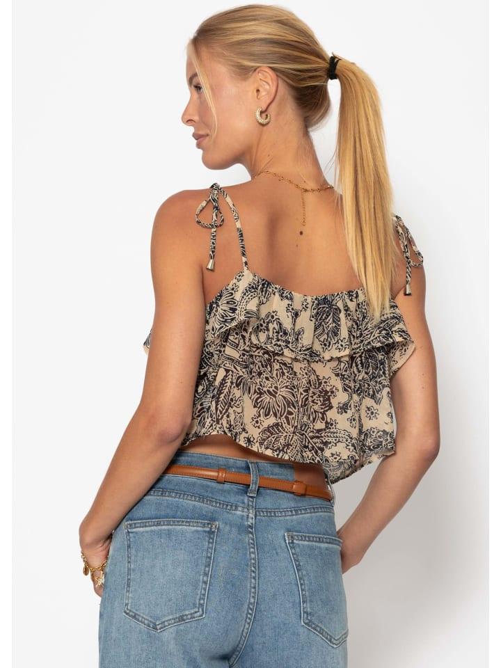 Этот шифоновый топ впечатляет своей воздушностью и легкостью, а также женственной отделкой воланом, которая элегантно подчеркивает принт по всей поверхности. Свободный силуэт обеспечивает комфорт, а регулируемые бретельки-спагетти позволяют регулировать посадку. V-образный вырез с декоративной оборкой добавляет игривости. Узелки на бретельках и нежный принт дополняют современный образ топа. Независимо от того, носите ли вы его повседневно с джинсами, в сочетании с юбками или как легкий слой под пиджаком, этот топ универсален и будет надежно сопровождать вас в теплые дни и в модных образах.