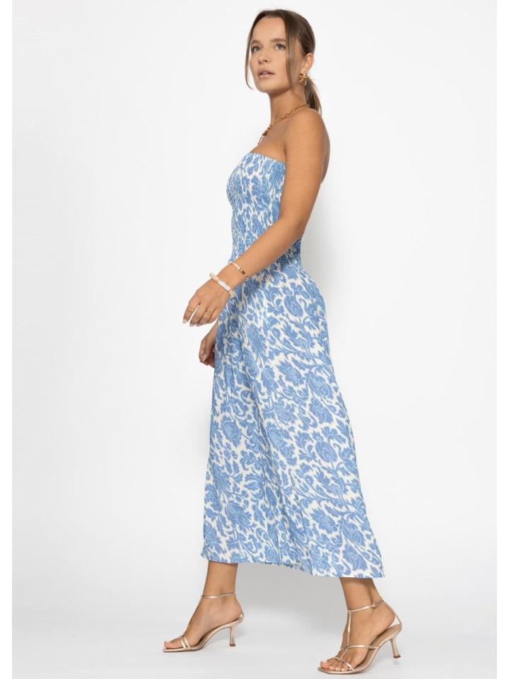 Это женственное летнее платье сочетает в себе стильный комфорт и игривую легкость. Очаровательный принт по всей поверхности, доступный в нежных оттенках розового или средиземноморского синего, делает платье по-настоящему притягивающим взгляды. Открытые плечи и присборенный верх не только обеспечивают надежную посадку, но и адаптируются к фигуре, выгодно подчеркивая силуэт. Мягко струящаяся юбка миди облегает ноги при каждом шаге, подчеркивая легкость образа. Изящные детали, такие как эластичное бюстье и цветочный узор, придают модели романтичный штрих. Будь то прогулка по городу, посещение кафе или очередная вечеринка в саду: это платье можно стилизовать по-разному, и оно будет стильно сопровождать вас все лето.