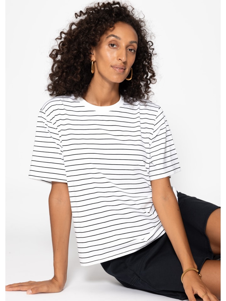 Эта повседневная футболка в полоску - идеальный вариант для стильного повседневного образа. Классический дизайн с короткими рукавами и классическим круглым вырезом делает ее универсальной базовой вещью. Свободный крой в сочетании с высококачественным составом из хлопка, вискозы и эластана обеспечивает мягкость и особый комфорт при ношении. Благодаря составу материала футболка не только комфортна, но и хорошо держит форму. Будь то с джинсами для непринужденного дня или в сочетании с юбкой для более шикарного образа - эта полосатая футболка станет идеальным дополнением к любому гардеробу и просто необходима всем, кто ценит стиль и комфорт.