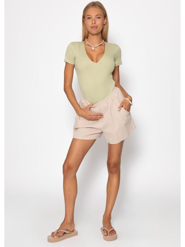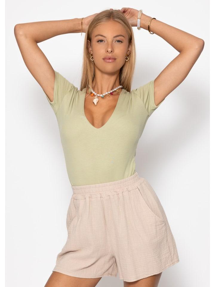 Это боди с короткими рукавами впечатляет своей минималистичной элегантностью и женственностью. Глубокий V-образный вырез деликатно подчеркивает зону декольте, а короткие рукава подчеркивают современный, сдержанный образ. Облегающий, эластичный крой удобно облегает тело и надежно фиксируется, не сползая. Изготовленное из мягкого, эластичного материала, боди обеспечивает максимальный комфорт и является универсальной незаменимой вещью - идеально подходит для сочетания с джинсами, юбками или под пиджаком.