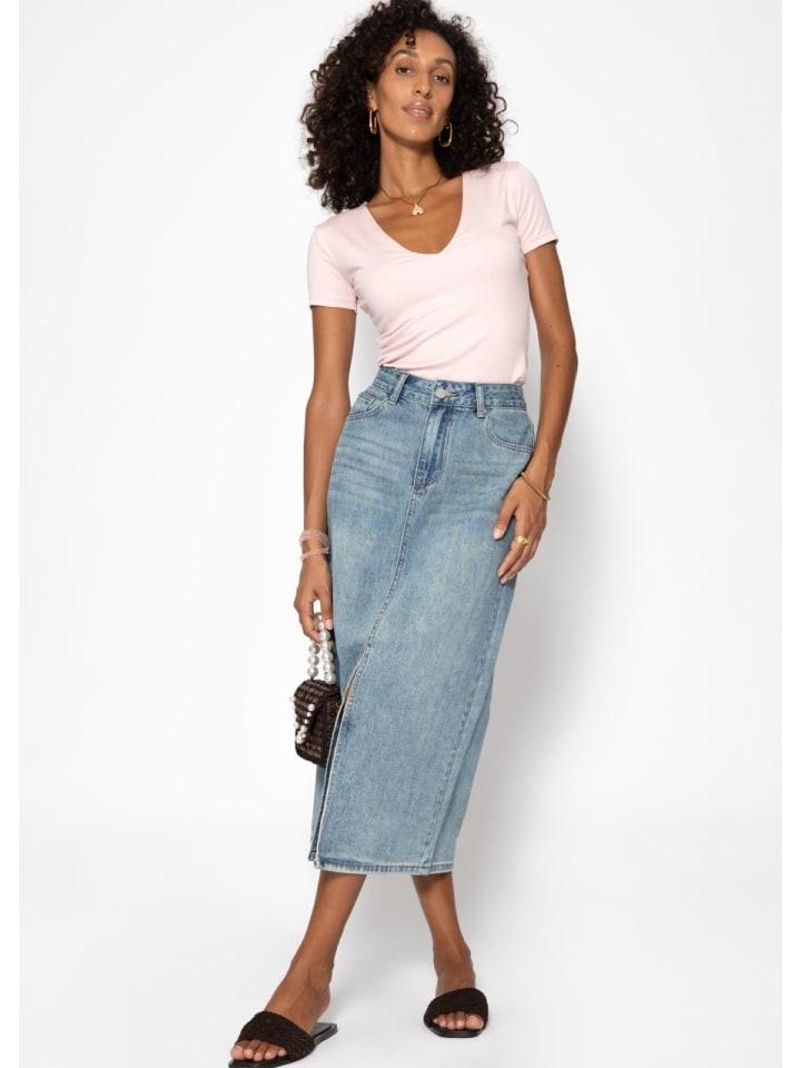 Наша джинсовая юбка с высокой талией, выполненная из денима средней плотности, сочетает в себе классический пятикарманный фасон с современным минимализмом и длиной миди. Облегающий крой подчеркивает талию, а потайная металлическая молния, шлевки для ремня, боковые карманы и тонкий разрез спереди обеспечивают практичность и свободу движений. Универсальный, сочетается с футболкой и кроссовками для повседневной носки или с блузкой и сандалиями для офиса - универсальная вещь, которая всегда актуальна и идеально сочетает в себе традиции денима и современные тенденции.