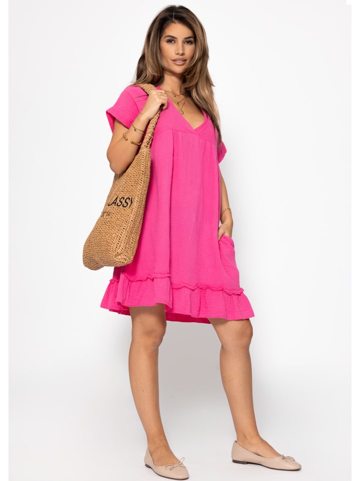 Это повседневное платье из мягкого хлопкового муслина станет идеальным спутником для солнечных дней - легкое, удобное и в то же время стильное. Дышащий материал приятен на ощупь и обеспечивает всесторонний комфорт. Свободный крой, женственный V-образный вырез, короткие рукава и очаровательный волан на подоле создают непринужденную летнюю элегантность. Практичные боковые карманы дополняют образ. Это платье можно носить по-разному, будь то повседневная одежда, прогулка по пляжу или прогулка по городу, и оно придаст вашему образу современный и непринужденный вид.