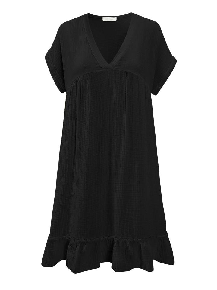 Это повседневное платье из мягкого хлопкового муслина станет идеальным спутником для солнечных дней - легкое, удобное и в то же время стильное. Дышащий материал приятен на ощупь и обеспечивает всесторонний комфорт. Свободный крой, женственный V-образный вырез, короткие рукава и очаровательный волан на подоле создают непринужденную летнюю элегантность. Практичные боковые карманы дополняют образ. Это платье можно носить по-разному, будь то повседневная одежда, прогулка по пляжу или прогулка по городу, и оно придаст вашему образу современный и непринужденный вид.