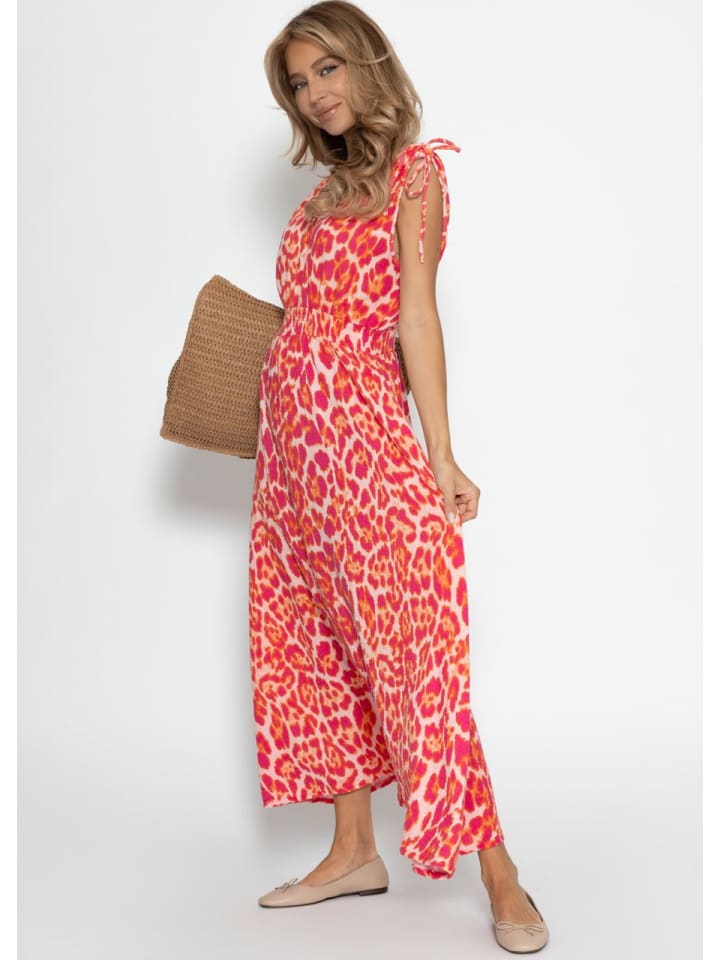 Это макси-платье из воздушного муслина сочетает в себе летний комфорт и эффектный дизайн. Мягко струящаяся ткань и эластичный пояс на талии создают женственный, струящийся силуэт. Глубокий V-образный вырез и завязывающиеся бретели добавляют игривые акценты. Яркий анималистичный принт делает платье по-настоящему притягивающим взгляды - идеально для отпуска, городских прогулок или садовых вечеринок.