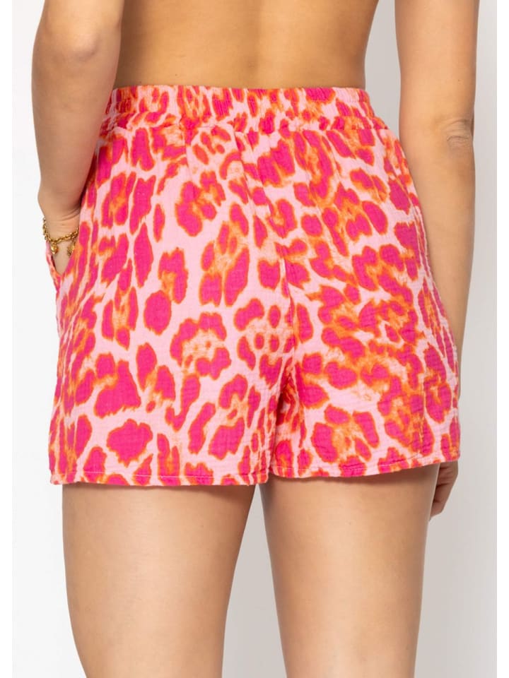 Эти шорты для отдыха из мягкого хлопкового муслина по-настоящему привлекают внимание благодаря модному леопардовому принту в ярких розовых и оранжевых тонах. Свободный, удобный крой и современная высокая талия обеспечивают полную свободу движений. Практичные детали, такие как удобные боковые карманы и эластичный пояс, обеспечивают дополнительный комфорт и удобство. Легкая и воздушная ткань делает эти шорты идеальными для повседневных образов, пляжных прогулок или в качестве яркого летнего аксессуара. Для создания особенно гармоничного и однородного образа можно также подобрать подходящую блузку в том же дизайне, но ее также можно прекрасно сочетать с однотонными топами.