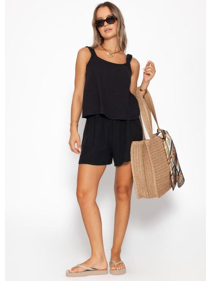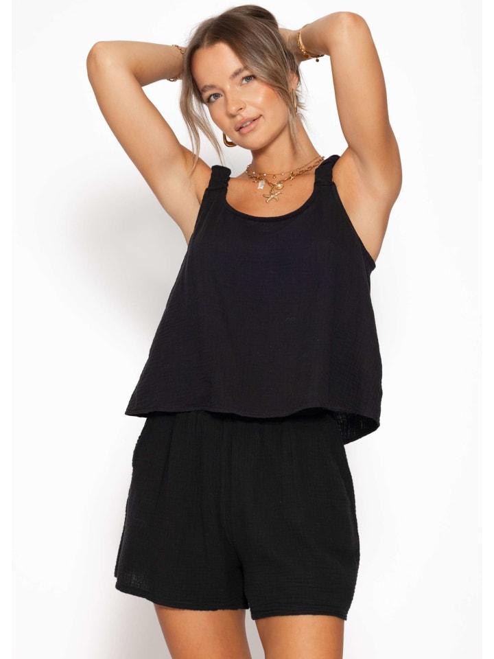 - ОСОБЕННОСТИ: Широкие собранные лямки, структурированная муслиновая ткань и слегка закругленный подолом делают этот топ фаворитом лета.