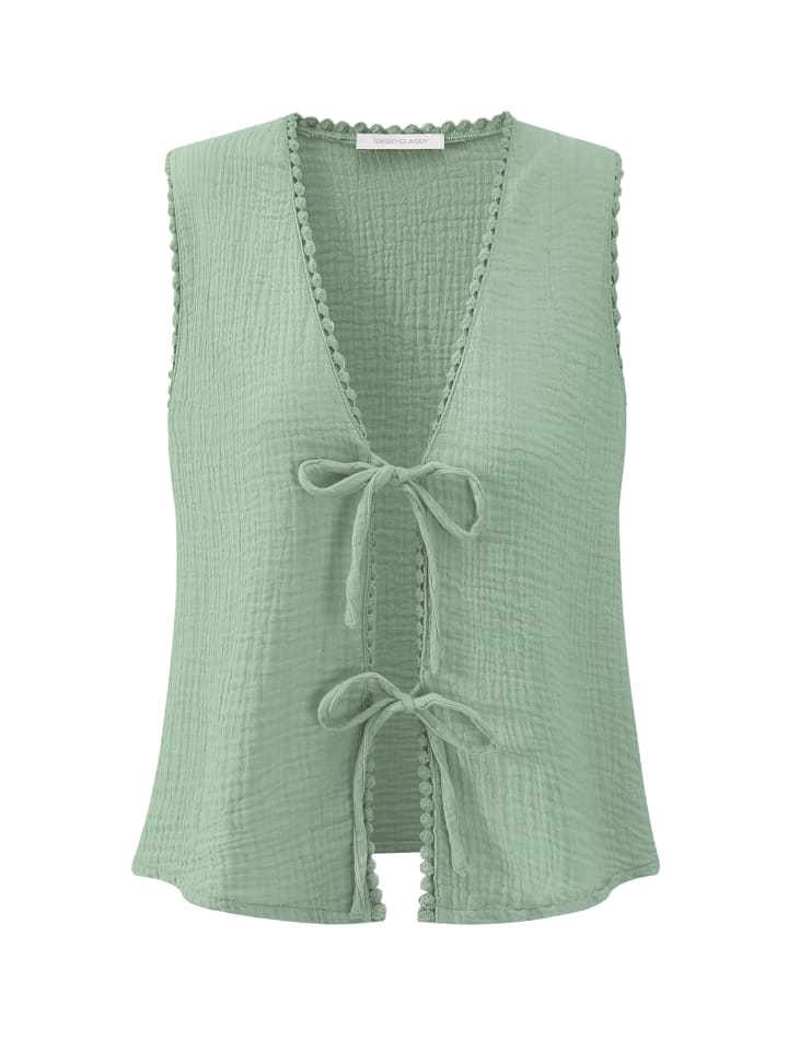 - ДИЗАЙН: Этот топ без рукавов с глубоким V-образным вырезом, декоративным вязаным крючком краем и завязками-бантиками создает очаровательные акценты для женственного, но современного образа.