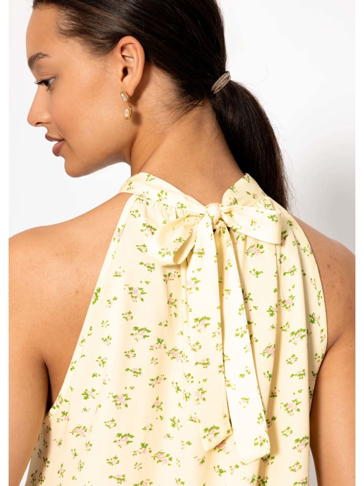 Этот топ без рукавов из легкой вискозы привнесет летнюю свежесть в любой гардероб. Свободный А-силуэт создает ощущение легкости и выгодно подчеркивает силуэт. Женственный вырез халтер с небольшим разрезом замочная скважина добавляет легкий акцент, а изящные сборки на шее создают элегантную драпировку. Нежный цветочный принт по всей поверхности подчеркивает женственность и придает изделию игривую легкость. Благодаря мягкой, струящейся и гладкой вискозе топ красиво драпируется и невероятно комфортен в носке. Эту модель можно сочетать с джинсами, шортами или юбками, и она прекрасно подходит как для повседневной носки, так и для летних мероприятий. Простая универсальная вещь, которая умело сочетает в себе стиль и комфорт.