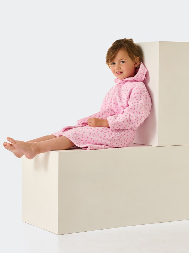 Представляем: новый плюшевый любимец вашей русалочки! Этот халат для девочек не только выглядит мило благодаря милому горошку, но и невероятно мягкий! Секрет в мягком велюре и, конечно же, лучшем экологичном хлопке SCHIESSER. Не хватает только большого капюшона, легко завязывающегося пояса и кармана, и уют начинается!