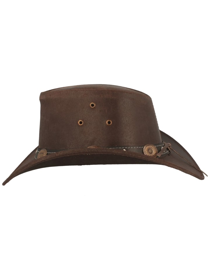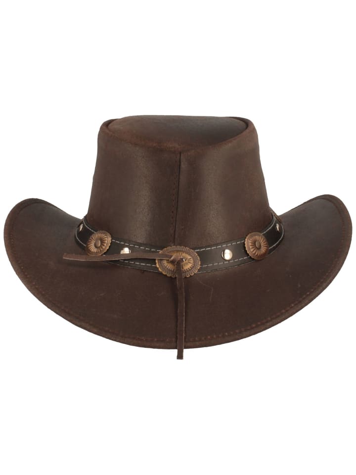 - Эта ковбойская шляпа из натуральной коровьей кожи впечатляет своей типичной изогнутой формой и кожаной отделкой, украшенной кончо, контрастной строчкой и металлическими заклепками.