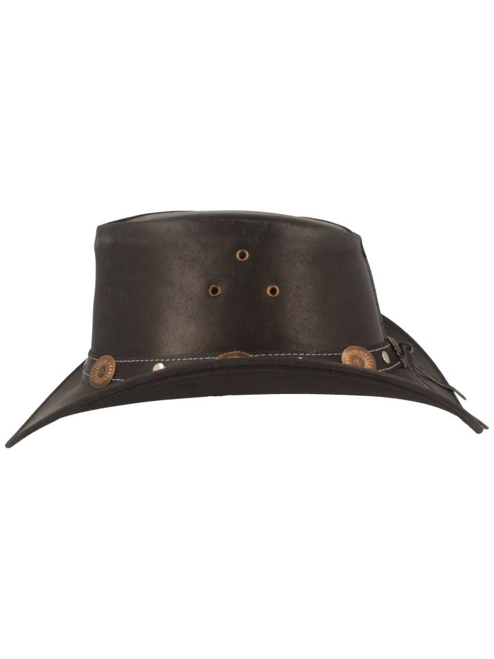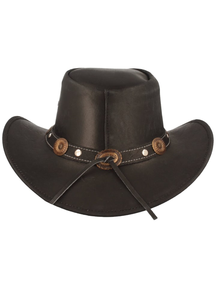 - Эта ковбойская шляпа из натуральной коровьей кожи впечатляет своей типичной изогнутой формой и кожаной отделкой, украшенной кончо, контрастной строчкой и металлическими заклепками.