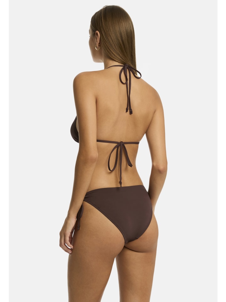 Треугольный верх бикини завязывается на шее и спине, обеспечивая индивидуальную посадку.