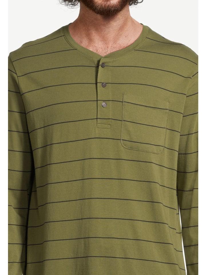 Этот пижамный комплект состоит из полосатого топа и однотонных брюк, создавая стильный образ. Верх застегивается на короткую планку с пуговицами, а брюки - на практичные карманы и удобный эластичный пояс. Изготовлен из однотонного трикотажа, он приятен на ощупь и обеспечивает естественный комфорт. Идеально подходит для спокойного сна и хорошего самочувствия дома.