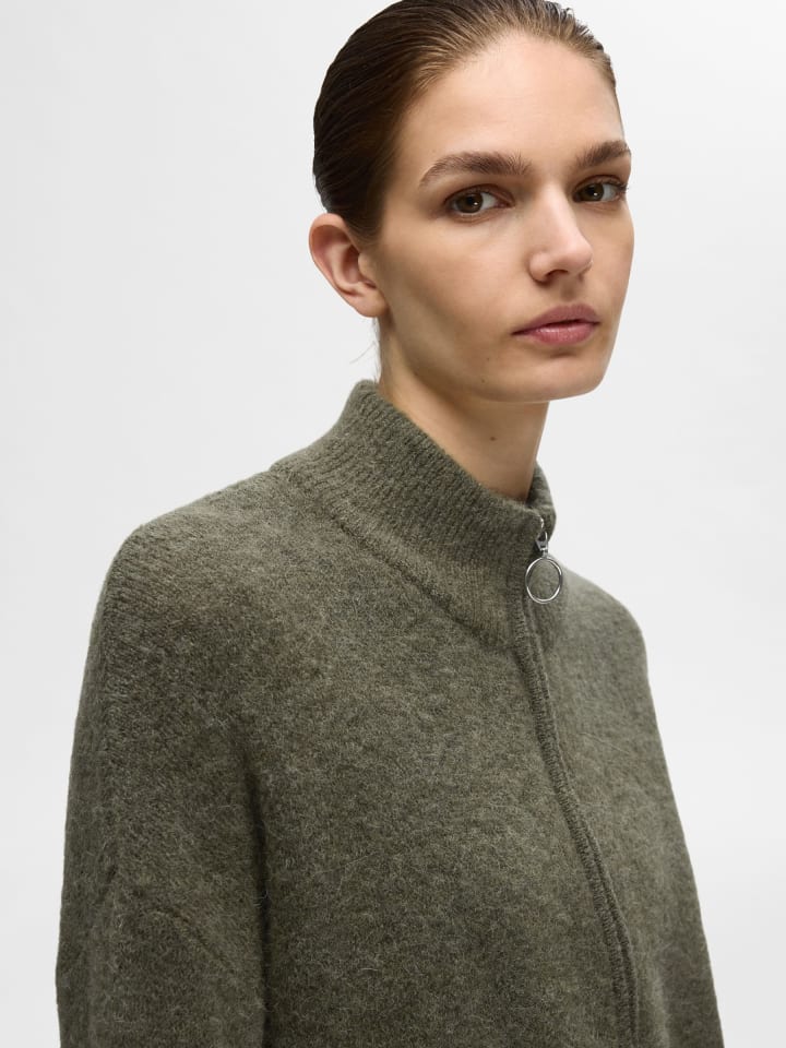 ---- Вязаный кардиган Уютный модный кардиган с воротником-стойкой и молнией спереди ---- Изделие соответствует размеру. Материал: 43% шерсть RWS, 30% альпака, 23% нейлон, 4% эластан Посадка: стандартная Застежка: молния 9210 Инструкция по уходу: сухая чистка.