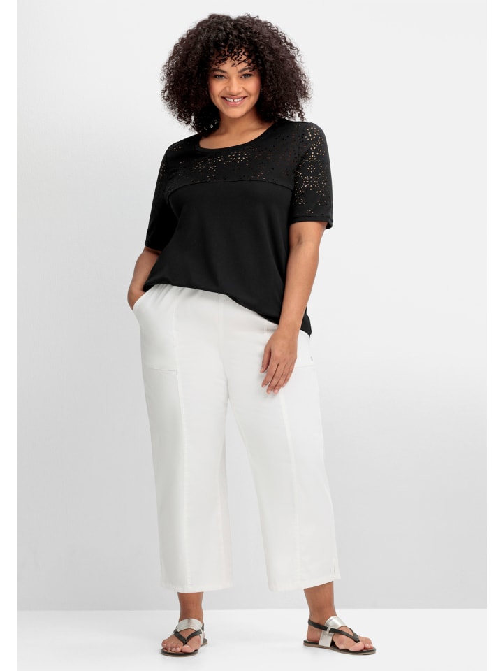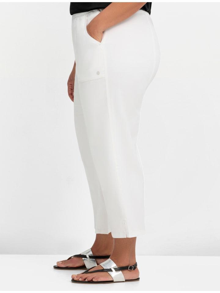Широкие брюки длиной 7/8. Повседневный фасон натягивается на талию с эластичным поясом очень удобен, а широкий крой обеспечивает ощущение воздушности. Большие накладные карманы обеспечивают много места, а центральные разделительные швы спереди и сзади визуально удлиняют фигуру. Брюки длиной до щиколотки с короткими боковыми разрезами по низу.