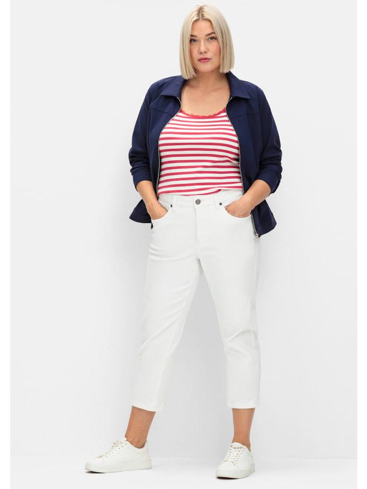Узкие джинсы скинни облегающего кроя длиной 7/8 с пятью карманами. Чистый, классический вид изящно разбавлен двухцветной контрастной строчкой. Контрастная лента внутри придает летний штрих: если подвернуть штанину, она будет видна у подола.