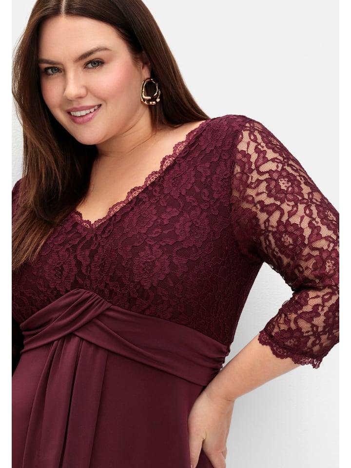 Вечернее платье длиной до икр. Цветочное кружево сверху добавляет элегантности, изящно приоткрывая кожу на рукавах длиной 3/4. Глубокий V-образный вырез спереди и сзади подчеркивает женственный образ. Широкий пояс с декоративным узлом притягивает взгляд, а широкая юбка-клеш ниже. Мелкая молния на спине завершает праздничный образ.