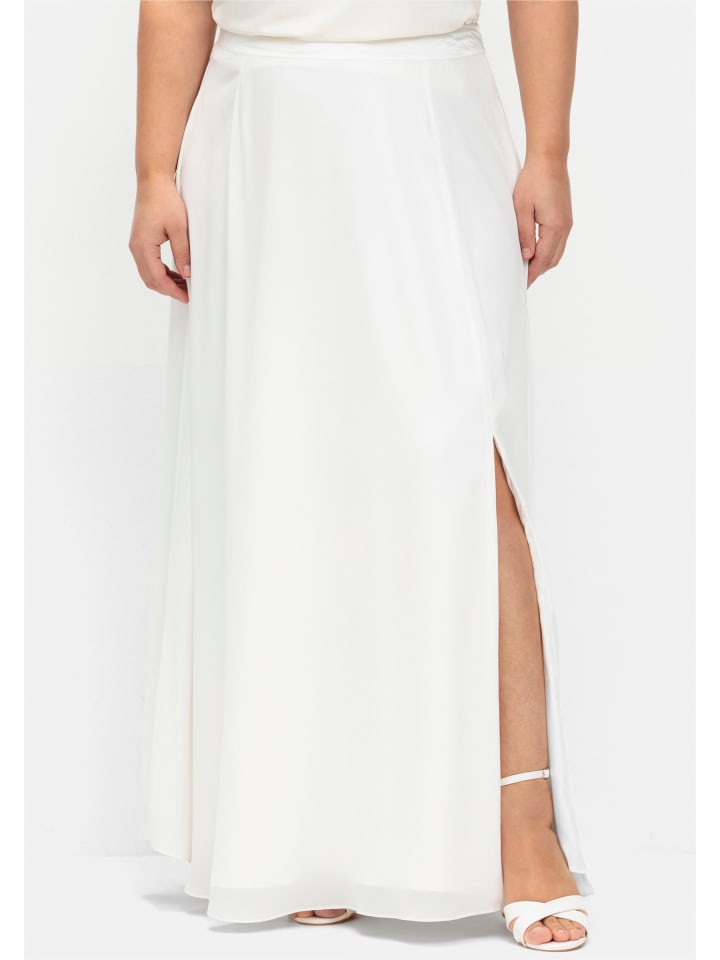 Юбка макси из шифона с боковым разрезом. Широкая, струящаяся юбка слегка расклешена к низу; высокий разрез обеспечивает изысканность и максимальный комфорт. Эластичный пояс с изысканным атласным оттенком также удобно сидит, а изящная молния сбоку. В результате получается элегантный стильный партнер, который идеально сочетается с нашими праздничными топами, а в нежно-белом цвете идеально подходит к свадебным нарядам sheego.