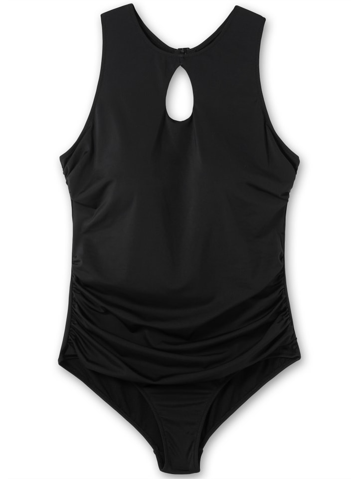 Купальник с вырезом. Женственный фасон отличается высоким круглым вырезом спереди и изысканной замочной скважиной в области декольте. Сзади удивляет большим овальным вырезом сзади и декоративной небольшой бретелькой. Чашечки с подкладкой, предварительно сформированные, создают красивое декольте, а широкие бретели обеспечивают надежную поддержку. Боковые сборки спереди от талии - модная деталь.