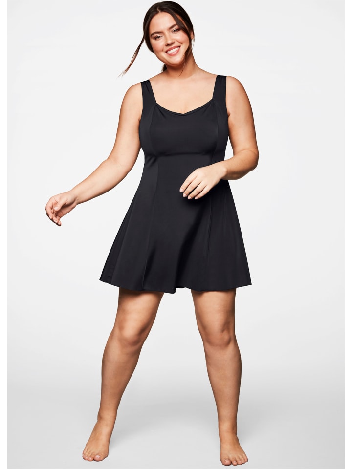 Свободная юбка красиво облегает бедра. Верхняя часть платья имеет сетчатую подкладку для утягивающего эффекта, а невидимые вшитые трусики с вырезами для ног непрозрачны и плотно прилегают к фигуре. Примечание: Купальник маломерит.
