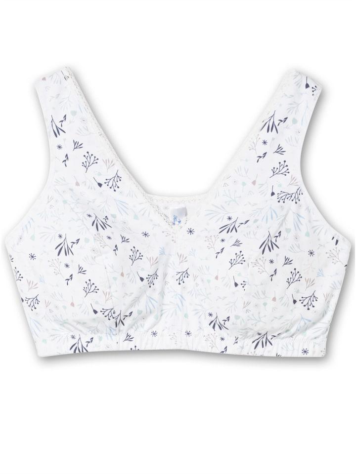Бюстье-бюстье без застежки. Нежный цветочный узор и кружевная отделка на вырезе придают ему женственность, а моделирующие разделительные швы обеспечивают оптимальную посадку. Удобный фасон без косточек делает это бюстье идеальным для сна.