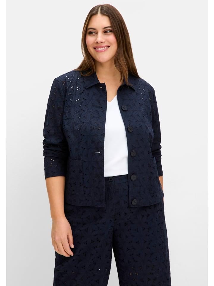 Куртка-блуза с вышивкой из люверсов по всей поверхности. Воздушное кружево с люверсами делает куртку слегка прозрачной и придает ей игривый летний вид. Также имеется отложной воротник, планка на пуговицах и накладные карманы. В сочетании с брюками этот комплект станет модным для солнечных дней.