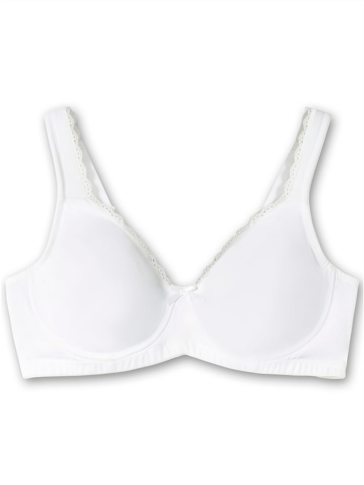 Бюстгальтер на косточках в двойной упаковке. Бесшовные, предварительно сформированные чашки идеально облегают грудь и создают красивую форму груди. Тонкая кружевная отделка на вырезе делает простой фасон женственным. Бюстгальтер также впечатляет своим высоким комфортом при ношении: чашки полностью закрывают грудь, а высокая центральная панель и боковые поддержки обеспечивают очень хорошую поддержку. Широкие, слегка подбитые бретели также не врезаются.