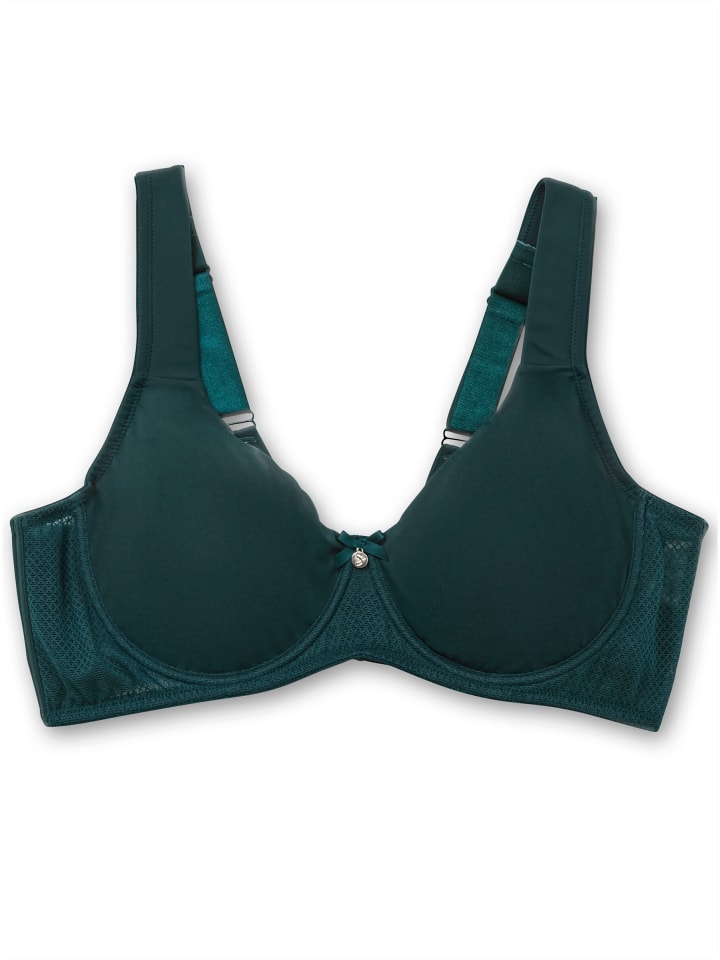 Комфортный бюстгальтер на косточках. Этот бюстгальтер на косточках впечатляет своим непрозрачным материалом и высоким комфортом при ношении: бесшовные чашки полностью закрывают грудь, высокая центральная часть обеспечивает поддержку, а широкие бретели не врезаются. Регулируемая застежка сзади также имеет мягкую подкладку. Кружевная вставка под грудью и внутренние усиливающие косточки под мышками обеспечивают дополнительную поддержку.