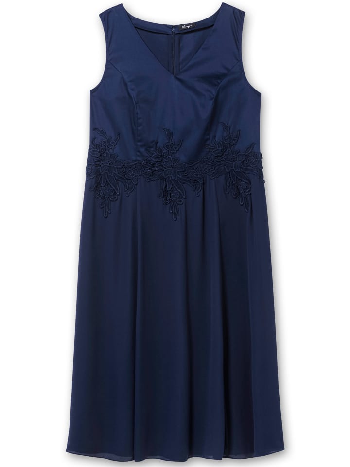 Коктейльное платье с цветочным кружевом. Верх из тонкого мерцающего атласа сочетается с юбкой из струящегося жоржета, создавая празднично-элегантное платье. На уровне талии сплошное цветочное кружево становится романтичным акцентом. Платье без рукавов имеет подчеркивающий фигуру V-образный вырез и широкие бретели. Бесшовная молния сзади позволяет легко надевать и снимать платье. Платье подчеркивает женственность фигуры, а широкая струящаяся юбка слегка расклешенного А-образного кроя стильно облегает силуэт.