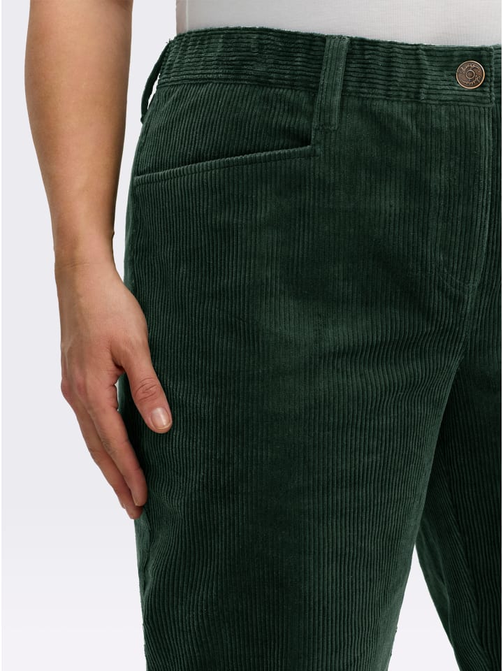 Брюки из вельвета прямого кроя. Эластичный пояс по всему периметру, шлевки для ремня, пуговица и молния придают им аккуратный, приталенный вид. Предварительно расположенные боковые швы и приталенные вытачки сзади подчеркивают фигуру, а Г-образные карманы не расстегиваются.