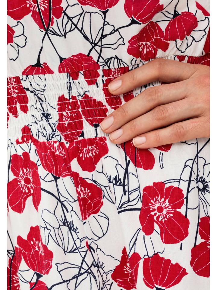 Платье с принтом и цветочным принтом. Платье имеет женственный V-образный вырез, а разрез с пуговицей сзади облегчает надевание. Талия искусно подчеркнута присборенным и поэтому очень удобным эластичным поясом. Далее следует расклешенная, широкая юбка миди длины. Разрезы по бокам обеспечивают дополнительное пространство для ног.