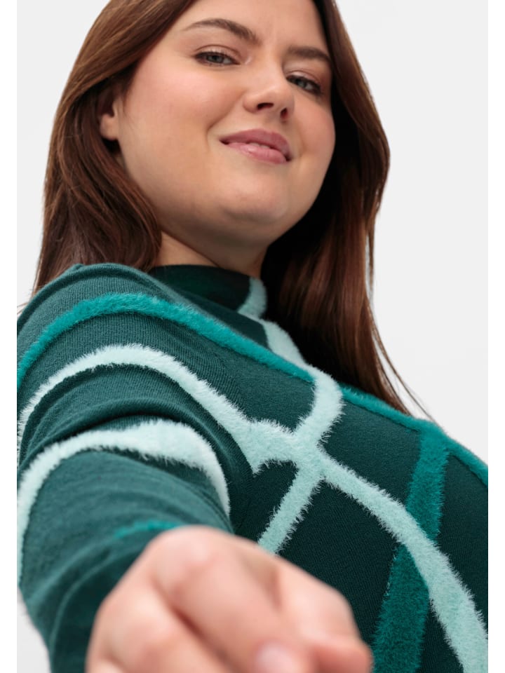Тонкий трикотажный свитер с интарсией из флисовой пряжи. Пушистые участки создают интересный контраст с аккуратной тонкой вязкой и создают современный образ. Короткий воротник-стойка и ребристые манжеты на рукавах и подоле дополняют модный и удобный образ.