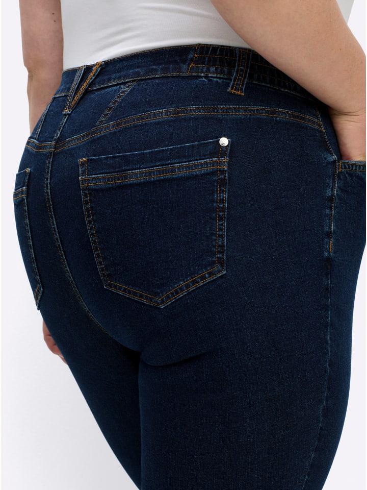 Узкие джинсы PIA облегающего кроя, идеально подходят для фигур с очень большими бедрами. Боковой эластичный пояс обеспечивает удобную посадку и застегивается на пуговицу и молнию. L-образные карманы не расстегиваются, а смещенный вперед боковой шов визуально удлиняет фигуру. К этому добавляются шлевки для ремня, накладные карманы сзади и современная стирка.