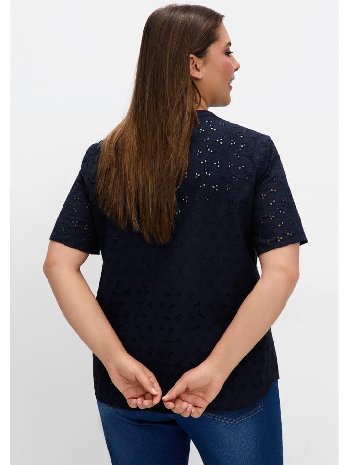 Блузка с вышивкой люверсами по всей поверхности. Воздушное кружево с люверсами делает блузку слегка прозрачной, придавая ей игривый летний вид. Блузка также имеет классический круглый вырез, планку с пуговицами и короткие рукава. В сочетании с подходящими брюками получается модный комплект для теплых дней.