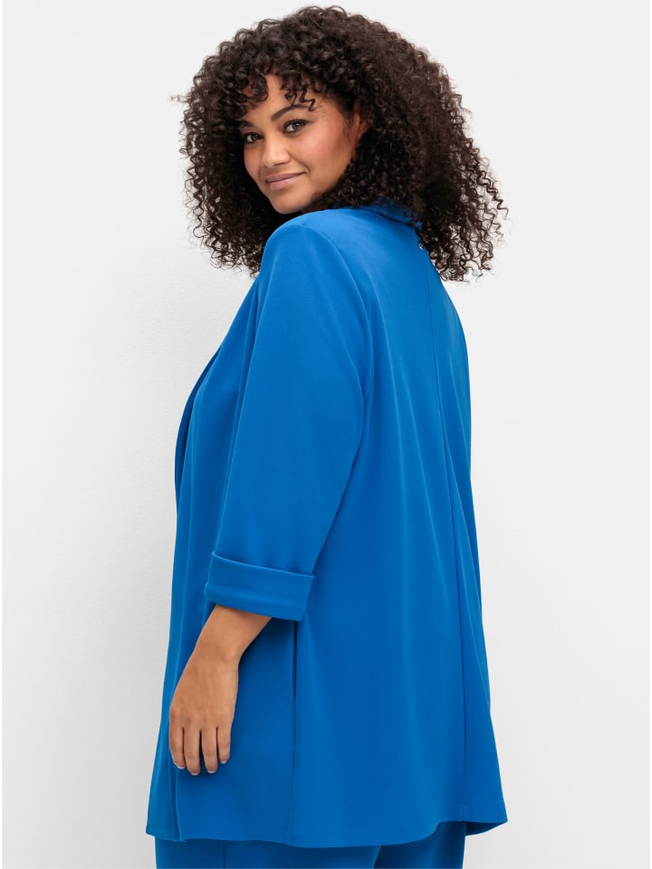 Блейзер без застежки длинный и облегающий покрой делает его очень удобным. Шалевый воротник и задний шов визуально удлиняют верхнюю часть тела. Крой искусно подчеркивает H-образную фигуру, а широкие плечи V-образной фигуры гармонично уравновешиваются рукавами-присборниками.