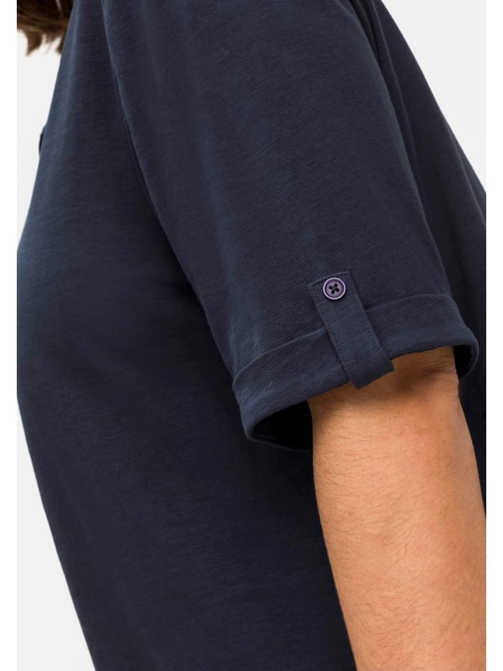 Рубашка длинного, широкого кроя. Круглый вырез с разрезом спереди добавляет женственности, а более длинные рукава украшены декоративными хлястиками. Боковые разрезы расположены на прямом подгибе.